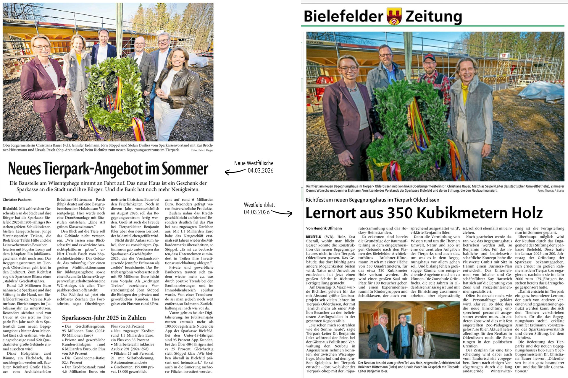 Gestern noch beim Richtfest, heute schon in der Presse: das Umwelt- und Begegnungshaus im Tierpark Olderdissen in den Bielefelder Tageszeitungen.